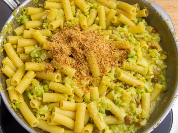 Pasta: The choice of pasta in this dish can vary, but traditional options include short pasta shapes like macaroni, orecchiette, or even spaghetti. The pasta serves as a base for the rich and flavorful cauliflower mixture.